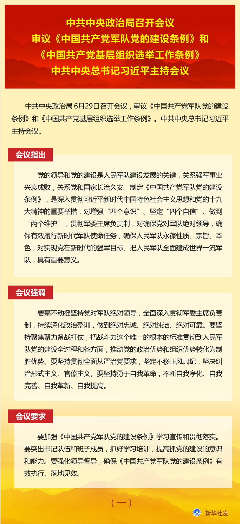 中共中央政治局召開會議 審議《中國共產(chǎn)黨軍隊黨的建設條例》和《中國共產(chǎn)黨基層組織選舉工作條例》 中共中央總書記習近平主持會議 新華社北京6月29日電 中共中央政治局6月29日召開會議,審議《中國共產(chǎn)黨軍隊黨的建設條例》和《中國共產(chǎn)黨基層組織選舉工作條例》。中共中央總書記習近平主持會議。 會議指出,黨的領導和黨的建設是人民軍隊建設發(fā)展的關鍵,關系強軍事業(yè)興衰成敗,關系黨和國家長治久安。制定《中國共產(chǎn)黨軍隊黨的建設條例》,是深入貫徹習近平新時代中國特色社會主義思想和黨的十九大精神的重要舉措,對增強“四個意識”、堅定“四個自信”、做到“兩個維護”,貫徹軍委主席負責制,對確保黨對軍隊絕對領導,確保有效履行新時代軍隊使命任務,確保人民軍隊永葆性質、宗旨、本色,對實現(xiàn)黨在新時代的強軍目標、把人民軍隊全面建成世界一流軍隊,具有重要意義。 會議強調,要毫不動搖堅持黨對軍隊絕對領導,全面深入貫徹軍委主席負責制,持續(xù)深化政治整訓,做到絕對忠誠、絕對純潔、絕對可靠。要堅持聚焦聚力備戰(zhàn)打仗,把戰(zhàn)斗力這個唯一的根本的標準貫徹到人民軍隊黨的建設全過程和各方面,推動黨的政治優(yōu)勢和組織優(yōu)勢轉化為制勝優(yōu)勢。要堅持貫徹全面從嚴治黨要求,堅定不移正風肅紀,堅決糾治形式主義、官僚主義。要堅持勇于自我革命,不斷自我凈化、自我完善、自我革新、自我提高。 會議要求,要加強《中國共產(chǎn)黨軍隊黨的建設條例》學習宣傳和貫徹落實。要突出書記隊伍和班子成員,抓好學習培訓,提高抓黨的建設的意識和能力。要強化領導督導,確保《中國共產(chǎn)黨軍隊黨的建設條例》有效執(zhí)行、落地見效。 會議指出,黨的十八大以來,以習近平同志為核心的黨中央高度重視基層黨組織選舉工作,對堅持和加強黨的全面領導、貫徹執(zhí)行民主集中制、規(guī)范完善黨內(nèi)選舉制度作出一系列重大部署,有力推動了基層黨組織建設。制定和實施《中國共產(chǎn)黨基層組織選舉工作條例》,是落實黨要管黨、全面從嚴治黨要求,是發(fā)揚黨內(nèi)民主、尊重黨員民主權利、規(guī)范基層黨組織選舉的具體舉措,對增強基層黨組織政治功能和組織力,把基層黨組織建設成為宣傳黨的主張、貫徹黨的決定、領導基層治理、團結動員群眾、推動改革發(fā)展的堅強戰(zhàn)斗堡壘,鞏固黨長期執(zhí)政的組織基礎,具有重要意義。 會議強調,要嚴格執(zhí)行選舉制度規(guī)定,提高黨內(nèi)選舉質量,保障黨章賦予的黨員權利,增強黨的意識、政治意識、規(guī)矩意識。要嚴格代表資格條件,確保選出合格的代表。要合理分配代表名額,優(yōu)化代表結構,確保生產(chǎn)和工作一線代表比例。要按照德才兼?zhèn)洹⒁缘聻橄群桶嘧咏Y構合理的原則提名委員候選人。要堅持教育在先、警示在先、預防在先,嚴肅政治紀律、組織紀律和換屆紀律,確保選舉風清氣正。 會議要求,各級黨委要加強對《中國共產(chǎn)黨基層組織選舉工作條例》實施的組織領導,嚴格落實黨委主體責任,加強謀劃,精心組織,全程把關。要貫徹執(zhí)行民主集中制,教育引導黨員和代表正確行使民主權利,保證選舉工作平穩(wěn)有序。要強化基層黨組織書記和黨務骨干培訓,提升工作規(guī)范化水平。要加強督促落實,確保《中國共產(chǎn)黨基層組織選舉工作條例》各項規(guī)定要求落到實處。 會議還研究了其他事項。 |