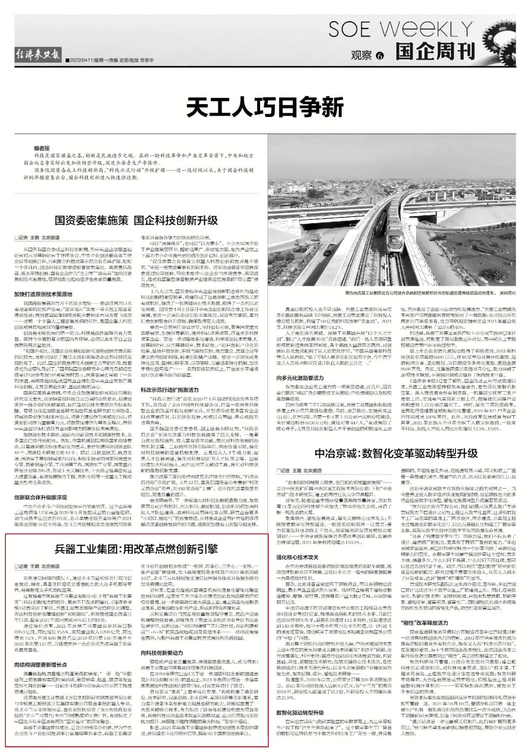 近日,中國(guó)兵器工業(yè)集團(tuán)有限公司國(guó)企改革三年行動(dòng)的經(jīng)驗(yàn)做法和工作成效引發(fā)媒體廣泛關(guān)注。中國(guó)新聞社、中國(guó)網(wǎng)、工人日?qǐng)?bào)客戶端、光明日?qǐng)?bào)客戶端、新華財(cái)經(jīng)、國(guó)資報(bào)告、人民網(wǎng)、國(guó)資委網(wǎng)站、人民政協(xié)網(wǎng)、《證券日?qǐng)?bào)》、學(xué)習(xí)強(qiáng)國(guó)平臺(tái)、央廣經(jīng)濟(jì)之聲、第一財(cái)經(jīng)客戶端、新華社、《經(jīng)濟(jì)參考報(bào)》、海外網(wǎng)、中工網(wǎng)、騰訊網(wǎng)、新浪網(wǎng)、搜狐網(wǎng)、網(wǎng)易網(wǎng)等中央主流媒體、國(guó)家部委網(wǎng)站及知名網(wǎng)絡(luò)媒體對(duì)集團(tuán)公司國(guó)企改革三年行動(dòng)情況進(jìn)行了刊載報(bào)道。 中國(guó)新聞社:兵器工業(yè)集團(tuán):國(guó)企改革三年行動(dòng)156項(xiàng)改革舉措2021年底已完成90%以上 中國(guó)網(wǎng):兵器工業(yè)集團(tuán)“四個(gè)堅(jiān)持”促改革 成效顯著 中國(guó)網(wǎng):兵器工業(yè)集團(tuán)體系化推進(jìn)民品發(fā)展戰(zhàn)略 布局17個(gè)重點(diǎn)產(chǎn)業(yè)領(lǐng)域 工人日?qǐng)?bào)客戶端:兵器工業(yè)集團(tuán)國(guó)企改革三年行動(dòng)取得顯著成效 光明日?qǐng)?bào)客戶端:兵器工業(yè)集團(tuán)國(guó)企改革三年行動(dòng)成效顯著 新華財(cái)經(jīng):兵器工業(yè)集團(tuán)三年行動(dòng)見(jiàn)實(shí)效 國(guó)資報(bào)告:聚焦高水平自立自強(qiáng),兵器工業(yè)集團(tuán)深化體制機(jī)制變革成效顯著 人民網(wǎng):“國(guó)企改革三年行動(dòng)”系列報(bào)道——三項(xiàng)制度改革進(jìn)一步走深走實(shí) 國(guó)有企業(yè)活力動(dòng)力明顯增強(qiáng) 國(guó)資委網(wǎng)站:【對(duì)標(biāo)世界一流 央企加速奔跑】兵器工業(yè)集團(tuán)國(guó)企改革三年行動(dòng)成效顯著 人民政協(xié)網(wǎng):兵器工業(yè)集團(tuán)改革舉措走深走實(shí) 創(chuàng)新激發(fā)企業(yè)活力 《證券日?qǐng)?bào)》:一季度17家央企控股上市公司實(shí)施股權(quán)激勵(lì) 業(yè)績(jī)印證激勵(lì)實(shí)效 學(xué)習(xí)強(qiáng)國(guó)平臺(tái):兵器工業(yè)集團(tuán)國(guó)企改革三年行動(dòng)成效顯著 第一財(cái)經(jīng)客戶端:國(guó)企改革三年行動(dòng)攻堅(jiān)沖刺,中長(zhǎng)期激勵(lì)有望深層次突破 新華社、《經(jīng)濟(jì)參考報(bào)》:國(guó)企改革三年行動(dòng)迎考 混改上市動(dòng)作頻頻 中長(zhǎng)期激勵(lì)擴(kuò)圍升級(jí) 《證券日?qǐng)?bào)》:年內(nèi)8家國(guó)有控股公司登陸A股 39家排隊(duì)中 《經(jīng)濟(jì)參考報(bào)》:兵器工業(yè)集團(tuán):用改革點(diǎn)燃創(chuàng)新引擎 |