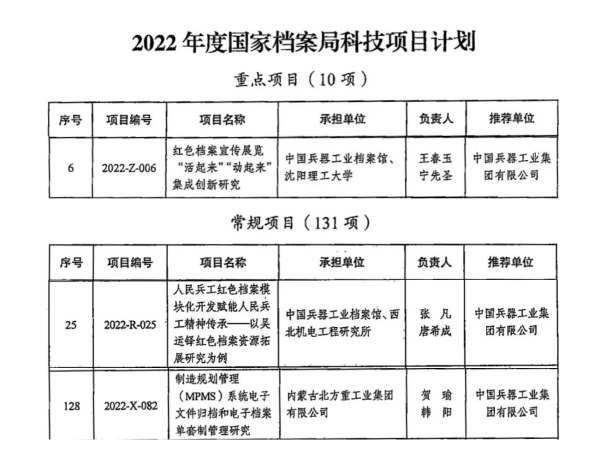 為深入貫徹落實《“十四五”全國檔案事業(yè)發(fā)展規(guī)劃》要求,著力提升檔案科研自主創(chuàng)新能力,根據(jù)《國家檔案局辦公室關于開展2022年度國家檔案局科技項目立項工作的通知》要求,中國兵器工業(yè)集團檔案館(以下簡稱檔案館)依據(jù)《2022年科技項目立項選題指南》,組織各單位申報成功三個檔案科技項目在國家檔案局立項,其中一個項目為國家級10項重點項目之一,排名第六,這是繼2021年在國家檔案局首次立項三個項目后的又一重大突破,標志著兵器工業(yè)檔案科研工作邁上新臺階。