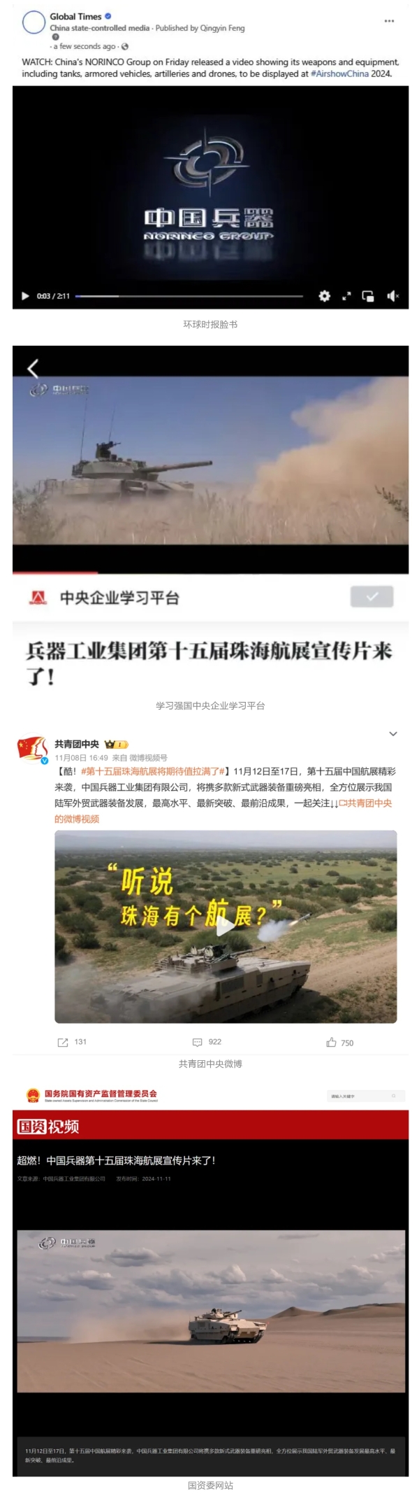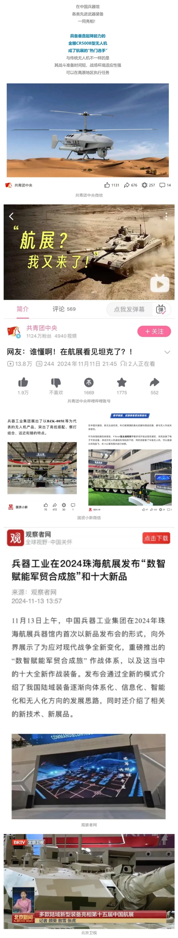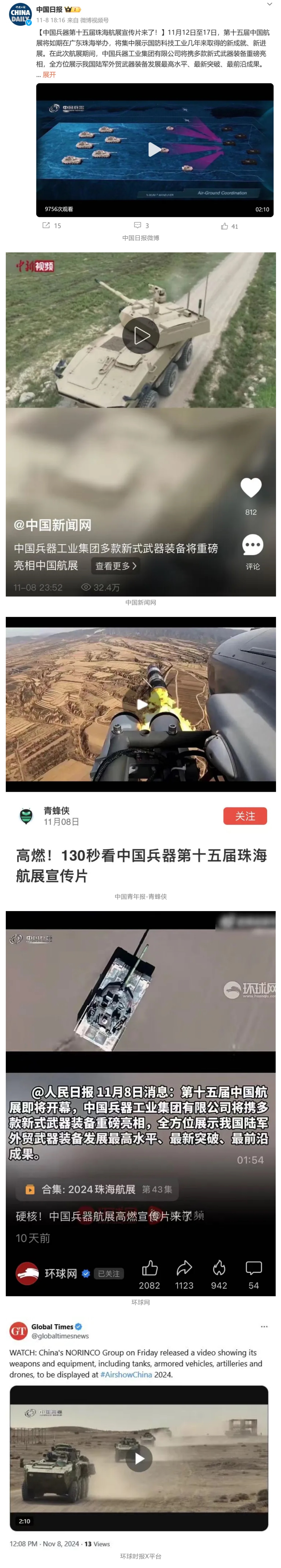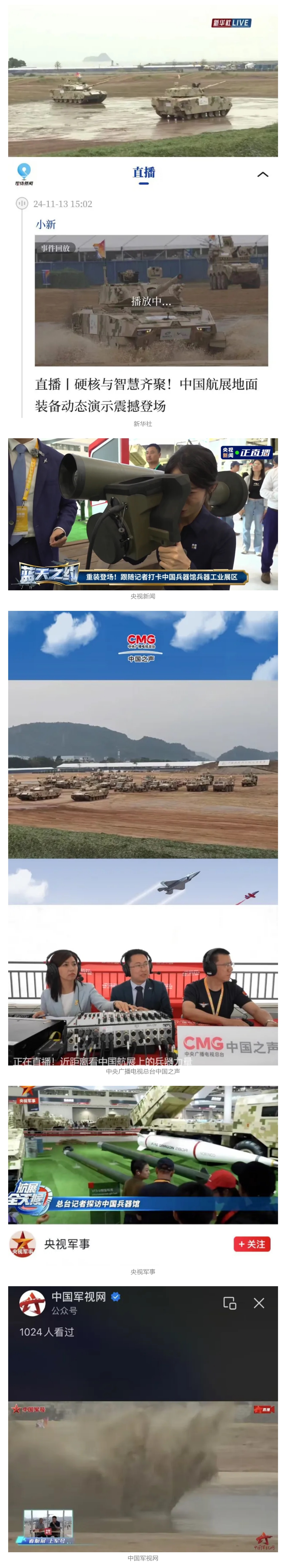新華社、央視新聞、中央廣播電視總臺中國之聲、央視軍事、中國軍視網(wǎng)、廣東廣播電視臺等媒體以及國家國防科工局、國資小新等到兵器工業(yè)集團(tuán)地面動態(tài)演示區(qū)、中國兵器館進(jìn)行了直播。