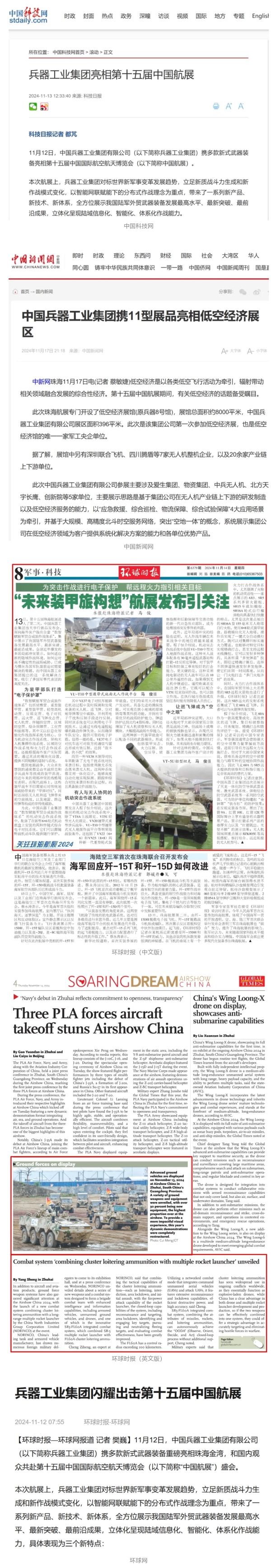11月13日央視新聞《藍(lán)天之約》直播地面裝備動態(tài)演示此次航展,央視綜合頻道《新聞聯(lián)播》《晚間新聞》、新聞頻道《新聞直播間》《新聞30分》《朝聞天下》《共同關(guān)注》《東方時空》《午夜新聞》、財經(jīng)頻道《天下財經(jīng)》《經(jīng)濟(jì)信息聯(lián)播》《正點(diǎn)財經(jīng)》《第一時間》、中文國際頻道《今日環(huán)球》《中國新聞》、國防軍事頻道《軍事報道》《正午國防軍事》《國防軍事早報》《軍迷行天下》等欄目共播出兵器工業(yè)集團(tuán)參展相關(guān)新聞報道40余條。11月10日央視新聞頻道《新聞30分》11月10日央視中文國際頻道《中國新聞》11月10日央視國防軍事頻道《軍事報道》11月11日央視國防軍事頻道《正午國防軍事》