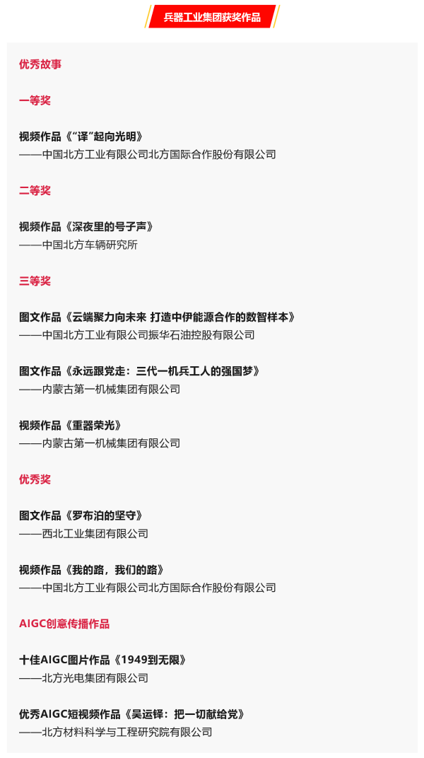 兵器工業(yè)集團(tuán)9件作品在第七屆中央企業(yè)優(yōu)秀故事暨AIGC創(chuàng)意傳播作品發(fā)布展示活動(dòng)中獲獎(jiǎng) |