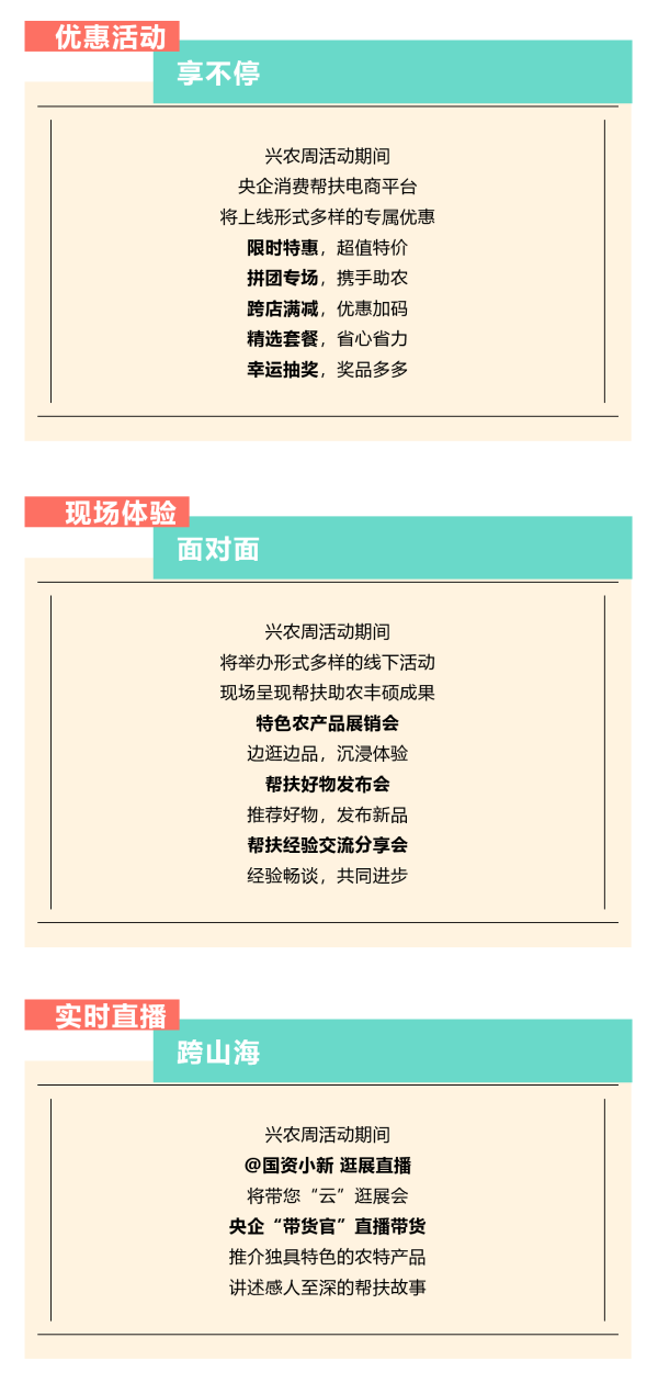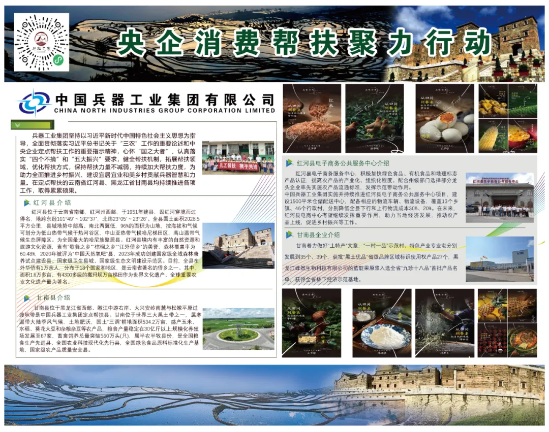 百家央企聚合力 消費幫扶促振興 第三屆“央企消費幫扶興農(nóng)周” 預(yù)售已啟動 8月30日 興農(nóng)周活動將正式開啟 “央企消費幫扶興農(nóng)周”由國務(wù)院國資委社會責(zé)任局指導(dǎo),央企消費幫扶電商平臺(國網(wǎng)數(shù)字科技控股有限公司)主辦,國務(wù)院國資委機關(guān)服務(wù)管理局、國務(wù)院國資委新聞中心、國網(wǎng)北京市電力公司、各中央企業(yè)電商平臺聯(lián)合協(xié)辦。 活動以“央企攜手,興農(nóng)惠民”為主題,組織動員中央企業(yè)所屬各單位各部門(特別是工會、食堂)、廣大干部職工、上下游供應(yīng)商和業(yè)務(wù)合作伙伴采購幫扶縣的優(yōu)質(zhì)農(nóng)產(chǎn)品,促進(jìn)脫貧地區(qū)產(chǎn)業(yè)發(fā)展和脫貧群眾穩(wěn)定增收,鞏固拓展脫貧攻堅成果。 預(yù)售活動火熱開啟 為方便大家提前選購 此次預(yù)售期升級為10天 (8月20日-8月29日) 誠邀下單 兵器工業(yè)集團(tuán)定點幫扶 黑龍江甘南縣、云南紅河縣 農(nóng)特產(chǎn)品! 8月30日-9月5日 請鎖定“央企館-兵器工業(yè)集團(tuán)” 我們一起共譜鄉(xiāng)村振興新篇章! |
