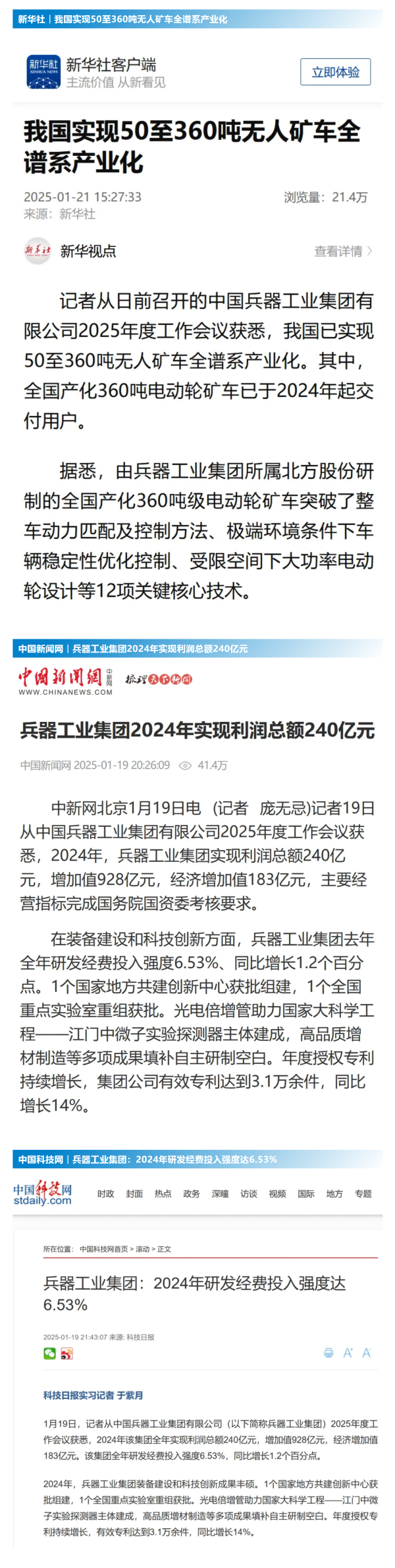 集團(tuán)公司2024年取得的成績(jī)及下一步重點(diǎn)工作受到社會(huì)媒體廣泛關(guān)注。新華社、中國(guó)新聞網(wǎng)、中國(guó)科技網(wǎng)、光明日?qǐng)?bào)客戶端、經(jīng)濟(jì)日?qǐng)?bào)客戶端、中國(guó)日?qǐng)?bào)網(wǎng)、國(guó)務(wù)院國(guó)資委網(wǎng)站、學(xué)習(xí)強(qiáng)國(guó)中央企業(yè)學(xué)習(xí)平臺(tái)、新浪網(wǎng)、網(wǎng)易網(wǎng)、搜狐網(wǎng)、騰訊網(wǎng)、鳳凰網(wǎng)等中央主流媒體、國(guó)家部委網(wǎng)站及知名網(wǎng)絡(luò)媒體對(duì)集團(tuán)公司2025年度工作會(huì)議進(jìn)行了報(bào)道,重點(diǎn)關(guān)注集團(tuán)公司經(jīng)營(yíng)業(yè)績(jī)、科技創(chuàng)新、產(chǎn)業(yè)結(jié)構(gòu)布局優(yōu)化等情況。其中,新華社以《我國(guó)實(shí)現(xiàn)50至360噸無人礦車全譜系產(chǎn)業(yè)化》為題,重點(diǎn)報(bào)道了集團(tuán)公司在推動(dòng)智能制造水平提升方面取得的成效;中國(guó)新聞網(wǎng)、光明日?qǐng)?bào)客戶端、經(jīng)濟(jì)日?qǐng)?bào)客戶端、中國(guó)日?qǐng)?bào)網(wǎng)等就集團(tuán)公司2024年度經(jīng)營(yíng)業(yè)績(jī)及各項(xiàng)工作取得的成果進(jìn)行報(bào)道;中國(guó)科技網(wǎng)著重報(bào)道了集團(tuán)公司在科技創(chuàng)新和優(yōu)化產(chǎn)業(yè)結(jié)構(gòu)布局方面的最新進(jìn)展。集團(tuán)公司門戶網(wǎng)站、微信公眾號(hào)、微博等新媒體平臺(tái)以及《中國(guó)兵工報(bào)》也對(duì)集團(tuán)公司工作會(huì)議進(jìn)行了及時(shí)報(bào)道,各成員單位紛紛對(duì)相關(guān)內(nèi)容進(jìn)行轉(zhuǎn)載,引發(fā)全系統(tǒng)關(guān)注。