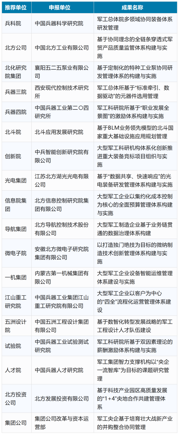 為促進(jìn)管理創(chuàng)新和改革發(fā)展,引導(dǎo)各單位在管理實(shí)踐中運(yùn)用現(xiàn)代管理科學(xué)理論和方法,創(chuàng)新經(jīng)營理念,革新管理制度,改進(jìn)管理方式、管理組織、管理方法,營造鼓勵(lì)創(chuàng)新、尊重知識(shí)、尊重實(shí)踐、尊重人才的創(chuàng)新環(huán)境。中國兵器工業(yè)集團(tuán)有限公司組織開展了2025年度管理創(chuàng)新成果的申報(bào)、推薦與審定工作。經(jīng)初審、初評、答辯及終審、公示等環(huán)節(jié),最終評出獲獎(jiǎng)成果91項(xiàng),其中:一等獎(jiǎng)18項(xiàng)、二等獎(jiǎng)24項(xiàng)、三等獎(jiǎng)49項(xiàng)。 兵器工業(yè)集團(tuán)2025年度一等獲獎(jiǎng)成果名單