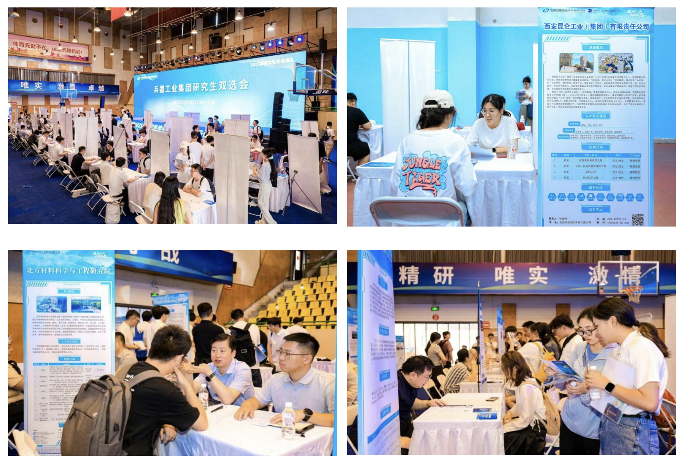 畢業(yè)生代表回顧成長歷程,感謝培養(yǎng)平臺與導(dǎo)師指導(dǎo),誓言投身國防事業(yè)。導(dǎo)師代表肯定學(xué)生科研淬煉的“嚴謹”與“擔當”,寄語傳承人民兵工精神,在強軍報國中實現(xiàn)價值。校友代表以科研經(jīng)歷詮釋兵工人使命,勉勵學(xué)弟學(xué)妹以裝備成果接力書寫強軍報國答卷。全體師生共同唱響《強軍有我》,鏗鏘有力的歌聲回蕩在體育館內(nèi),既飽含著對青春理想的告白,更傳遞出投身國防事業(yè)的堅定信念,為這場畢業(yè)盛典增添了厚重的使命底色。 典禮的莊重氛圍未散,兩場精準對接國防需求的雙選會已在相鄰場館同步開啟。60家集團公司下屬單位的招聘人員與2025屆畢業(yè)生、在讀研究生及工程碩博士們圍坐洽談,圍繞崗位需求與項目方向,以簡歷和科研成果為媒展開深度對接。這場覆蓋多層次人才的就業(yè)服務(wù),精準銜接科研人才儲備與國防需求,為兵器事業(yè)高質(zhì)量發(fā)展注入活力。  兵器工業(yè)集團研究生雙選會現(xiàn)場
